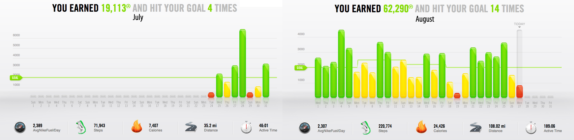 In conclusion, I still very much like the Fuelband. As I’ve said after my first week with the device, I’m much more willing to walk to destinations and perform more physical actions in an attempt to raise my Fuel count. Unfortunately, if I’m already at home after a long day and I haven’t met my goal, I do not feel any more motivated to meet my goal. Part of this is due to my ability to reach my goal without doing anything more and the other part is because the Fuelband’s counting is not that accurate or consistent. I have uploaded my performance from the past month and have a 50% “Goal Met” rate, which I do not feel particularly bad about. I believe the Fuelband can be a very effective tool to use but after a month or so – I’m mostly just humored by when I shatter my goal on dancing-filled weekends rather than feel pressure from low Fuel on those lazy Mondays.