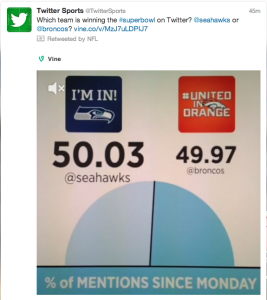 | 3) @TwitterSports - Which team is winning on Twitter? Twitter covered which team and which players were winning on Twitter (most mentions) during the lead to SB48 and during the big game as well. They made Twitter even more of a game with these social media competitions. | ![]() | @TwitterSports |