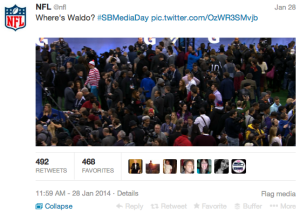 | 5) Where's Waldo? This guy dressed up like Waldo from Where's Waldo to add some #FunTheory to Media Day. Where's Waldo is a great example of how to gamify a book! | ![]() | @nfl @whereswaldo #SBMediaDay |