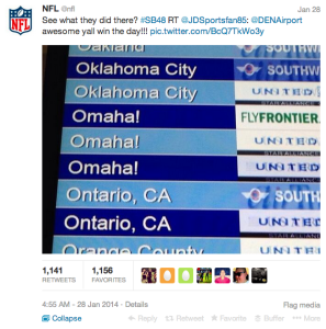 | 6) Omaha! Omaha! Every football fan knows that Peyton Manning single-handedly added "Omaha" to football vocabularly--which Warren Buffet must be proud of. Denver Airport added a sense of play to a standard flight screen by changing "Omaha" to "Omaha!" Classic, simple and brilliant. In addition, some companies were offering donations for every "Omaha" that Manning said during the Super Bowl and some playoff games. | ![]() | #Omaha @DENAirport @OmahaChamber |