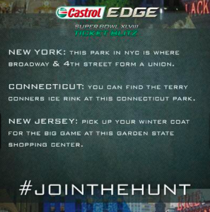 | 2) Castrol's #JoinTheHunt Castrol created a scavenger hunt for fans during Super Bowl 48 to take a selfie in front of specific places--places that were tweeted out. Top prize was 2 tickets to Super Bowl 48. Read the official rules here | ![]() | #JoinTheHunt @CastrolUSA |