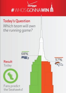 | 1) Verizon's #WhosGonnaWin Campaign with the Empire State Building Verizon teamed up with the Empire State Building in NYC to get fans to vote for who they thought was going to win Super Bowl 48. Each evening leading up to #SB48, a winner would be voted for and then the Empire State Building would glow in that team's colors for the rest of the night. Read more about this story here | ![]() | #WhosGonnaWin #Broncos #Seahawks @VerizonWireless @EmpireLights |